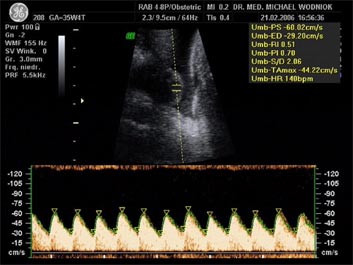 Zur Komplettierung der Infektionsdiagnostik wird frühzeitig ein Muttermundsabstrich auf Chlamydien durchgeführt. Zusätzliche Untersuchungen auf spezielle Infektionen im Rahmen der Schwangerschaftsvorsorge sind nur bei klinischem Verdacht vorgesehen. Ultraschall ![]() ![]() ![]() ![]() ![]() ![]() Weitere Ultraschalluntersuchungen sind in der 10./20./30. Schwangerschaftswoche gemäß den Mutterschaftsrichtlinien vorgesehen. Bei erkennbaren Risiken werden weitere Untersuchungen angeschlossen. Spezielle Ultraschalluntersuchungen zum Ausschluss von kindlichen Entwicklungsstörungen sowie Durchblutungsmessungen der mütterlichen und kindlichen Blutgefäße mittels Farbdopplersonographie gehören zum Leistungsspektrum der Praxis. Auf Wunsch können auch 3D und 4D Untersuchungen angeboten werden. Blutflußmuster (Nabelschnurarterie) Zu Anfang der Schwangerschaft werden wir Ihnen ausführliches Informationsmaterial über die Schwangerschaft mitgegeben. Im nächsten Gespräch werden wir Sie individuell beraten und Sie können entscheiden, welchen Umfang Ihre persönliche Schwangerschaftsvorsorge haben soll und welche Untersuchungen Ihnen wichtig sind! Wir werden Ihnen diese Untersuchungen im Bereich Individuelle Gesundheitsleistungen (IGEL) vorstellen. Eine kurze Übersicht aller Untersuchungen zeigt die unten aufgeführte Tabelle. Bei Besonderheiten während der Schwangerschaft oder bei Risikoschwangerschaften können sich natürlich Abweichungen ergeben.